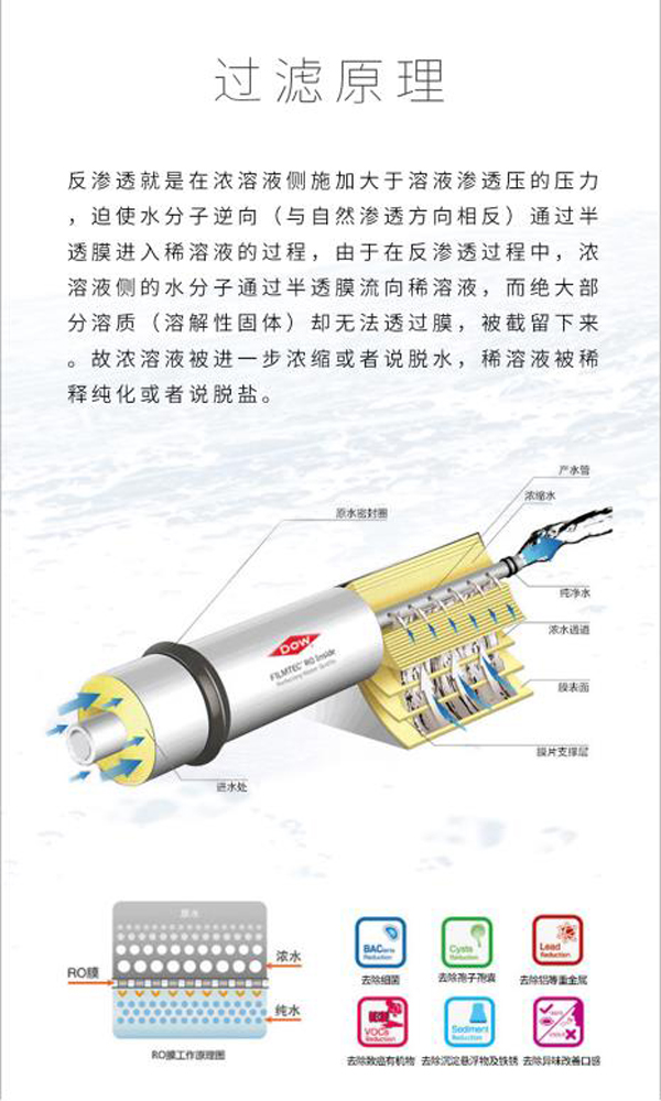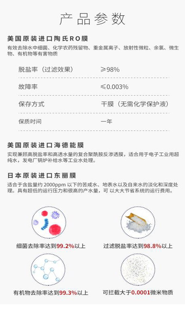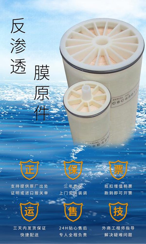 後hou置zhi,是shi反fan滲shen透tou設she備bei具ju有you高gao脫tuo鹽yan率lv和he高gao產chan水shui量liang。陶tao氏shi反fan滲shen透tou膜mo特te有you的de抗kang汙wu染ran膜mo技ji術shu具ju有you卓zhuo越yue的de抗kang汙wu染ran能neng力li和he可ke清qing洗xi性xing,該gai產chan品pin結jie合he了le陶tao氏shi FILMTEC TM BW30FR-365和 BW30FR-400膜元件的優點。